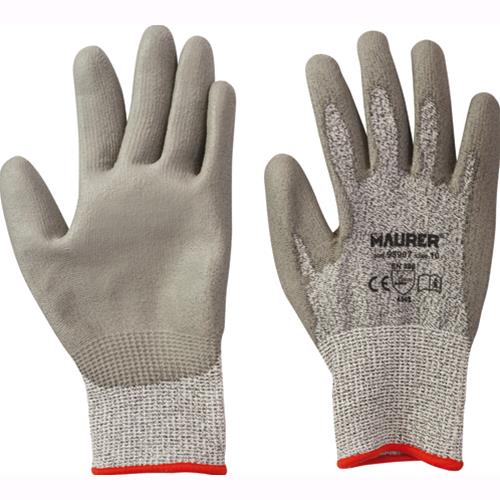 Guanto filato speciale ANTITAGLIO senza cuciture - Spalmatura in poliuretano grigio su palmo e punta sulle dita - Resistenza abrasione 4, taglio 5, strappo 4, perforazione 3 - Ideale per elettronica, taglio del vetro, manipolazione metalli e lamiere - Norme CE EN 388 EN 420 4543 - Cf. su cavaliere