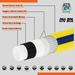 • Tubo in PVC retinato con 6 strati: Interno Bianco, intermedio nero antialga, con doppia magliatura, esterno Giallo coprente e righe azzurre.